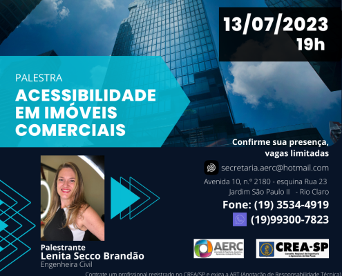 A AERC abre novamente as portas de sua sede para receber seus associados e a quem se interessar para participar da palestra "ACESSIBILIDADE EM IMÓVEIS COMERCIAIS", com a palestrante Engª Lenita Secco Brandão, especialista na área de Acessibilidade.