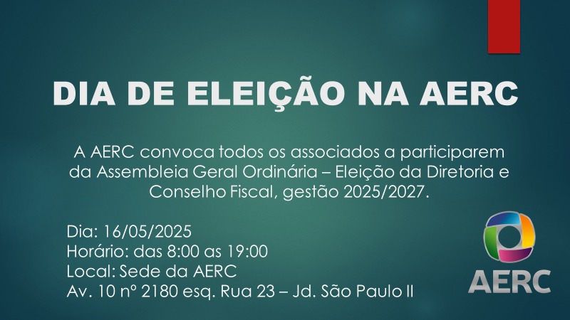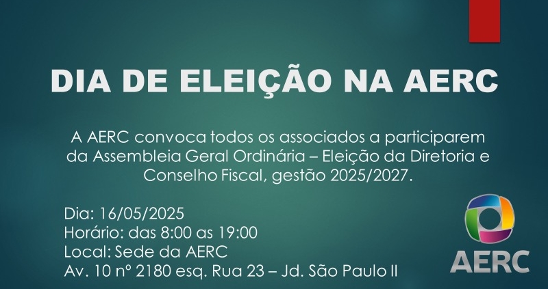 A AERC convoca todos os seus associados a participarem da Eleição da nova Diretoria e do Conselho Fiscal, que acontecerá no dia 16 de maio de 2025 (sexta-feira).